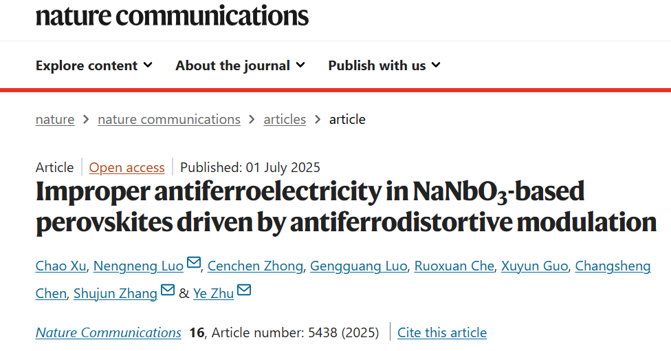 近年来,该团队紧密围绕关键金属基电介质材料开展科学研究,取得了系列重要研究进展。今年早些时候,该团队与香港理工大学、澳大利亚伍伦贡大学等单位合作,利用球差矫正透射电子显微镜首次在NaNbO3基反铁电陶瓷中观察到了非常规反铁电特性(Improper antiferroelectricity),并结合第一性原理计算证实该特殊结构主要由八面体畸变驱动。该结构的发现有望拓展无铅反铁电材料在功能领域的新应用,相关成果发表于Nature Communications(2025, 16, 5438),我校罗能能教授为共同一作和通讯作者。