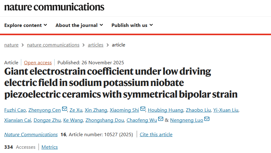 近日,我院科研团队研发出具备超低驱动电场和巨应变系数的铌酸钾钠无铅压电材料,性能超越当前主流的铅基压电体系,在高精度微型器件应用领域上展现出巨大的潜力。该成果以 “Giant electrostrain coefficient under low driving electric field in sodium potassium niobate piezoelectric ceramics with symmetrical bipolar strain”为题,发表在国际知名期刊《自然·通讯》(Nature Communications, 2025, 16, 10527.)上。成人色情