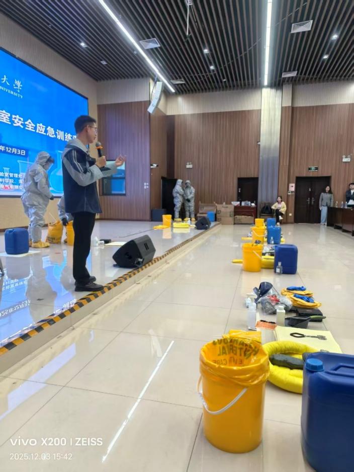 负责应急训练培训的埃德伯格公司安全工程师何楠介绍了本次训练营的筹备背景、课程设置及核心目标任务,强调应急处置能力是实验室安全管理的“最后一道防线”。本次应急训练营聚焦化学品泄漏应急处置核心模块,结合全校12个学院危险化学品实验的不同特点,针对性开展有机废液和硫酸泄露的应急演练。