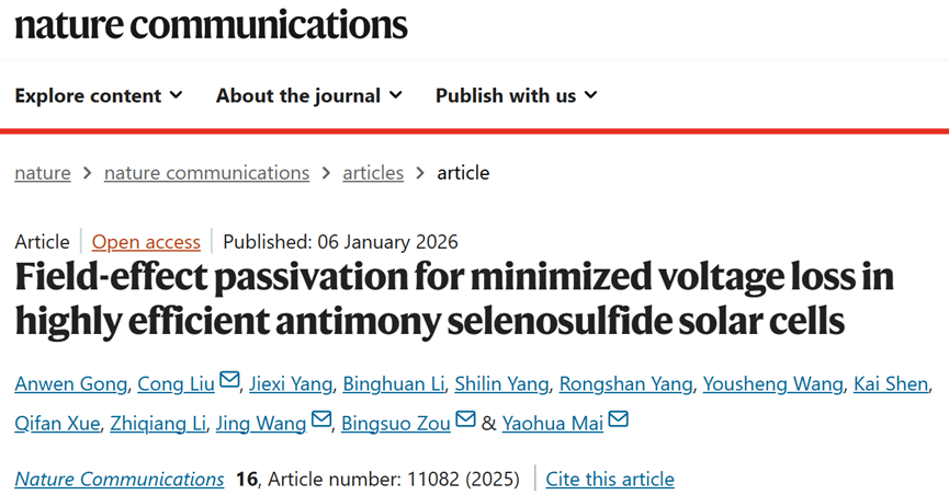 近日,我院邹炳锁教授领衔的纳米光子学材料与技术团队在硒硫化锑(Sb2(S,Se)3)太阳电池领域取得新进展,相关成果以“Field-effect passivation for minimized voltage loss in highly efficient antimony selenosulfide solar cells”为题,发表在国际顶级期刊自然通讯 (Nature Communicatios)。资环材学院2025级博士研究生龚安稳为第一作者,邹炳锁教授、刘聪助理教授、暨南大学麦耀华教授和广东工业大学王晶副教授为共同通讯作者,成人色情