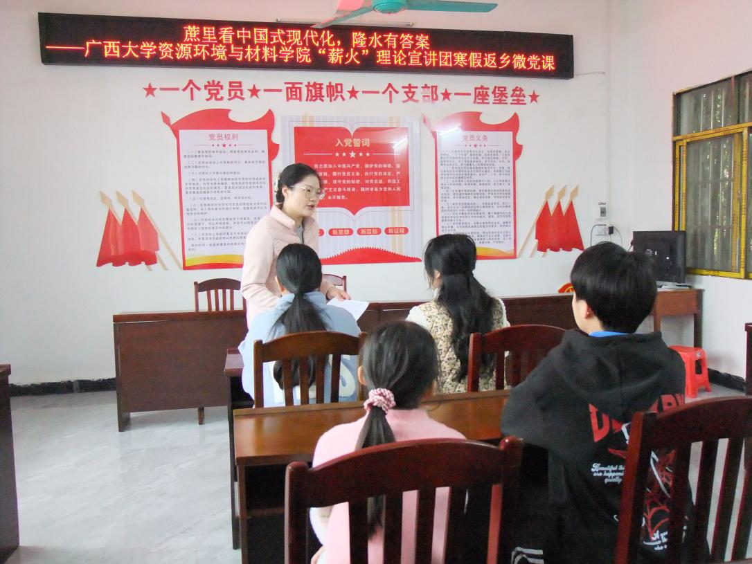 2月5日,柳城县隆水村村委会议室里,一场别开生面的微党课正在进行。我院“薪火”理论宣讲团成员张馨丹同学以“蔗里看中国式现代化,隆水有答案”为主题,与村内中小学生代表深入探究家乡糖料蔗产业从“靠蔗吃饭”到“科技赋能”的蜕变之路。她结合隆水村培育特色产业、推动绿色发展的生动实践,生动阐释中国式现代化的基层答卷。现场,张馨丹还详细介绍学校资助政策体系和学院学科特色,鼓励孩童以学业为重,努力为中国式现代化挺膺担当。