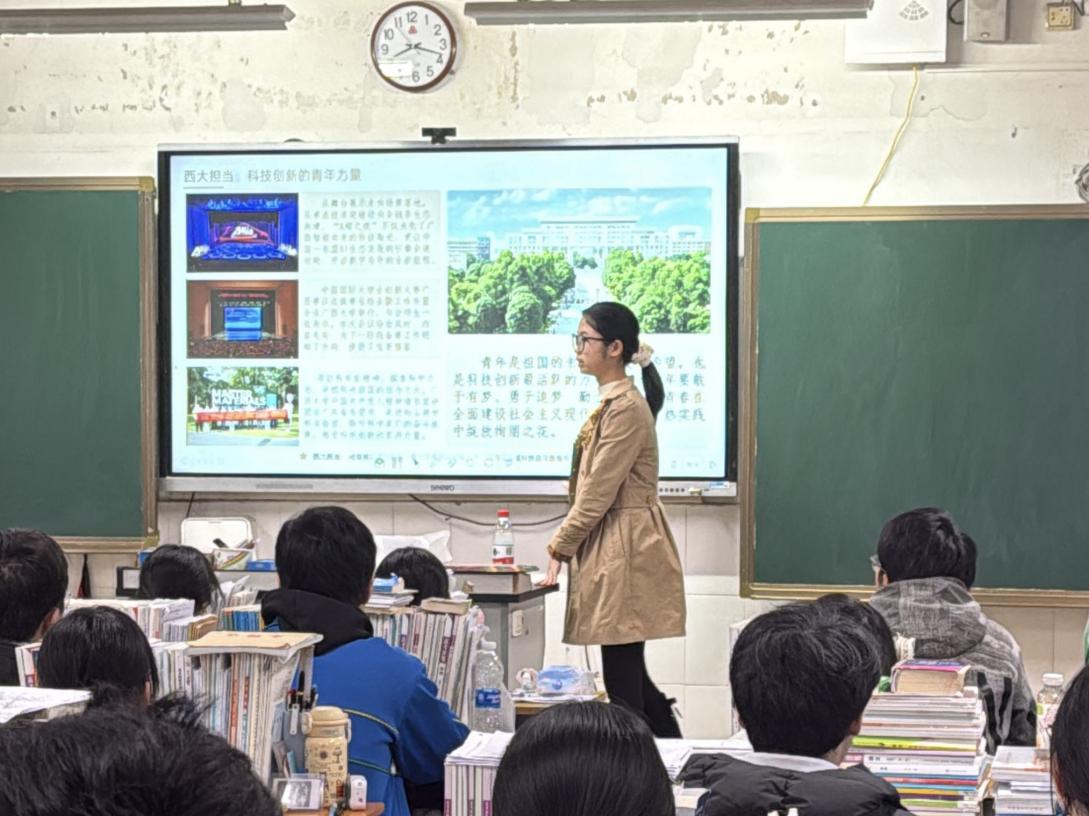 1月25日,三江侗族自治县三江中学的教室里,程玲丽同学为学弟学妹们打开了一扇望向大学的窗。她以西大“青言传播”专题为依托,融入井冈山精神与习近平新时代中国特色社会主义思想,从成人色情