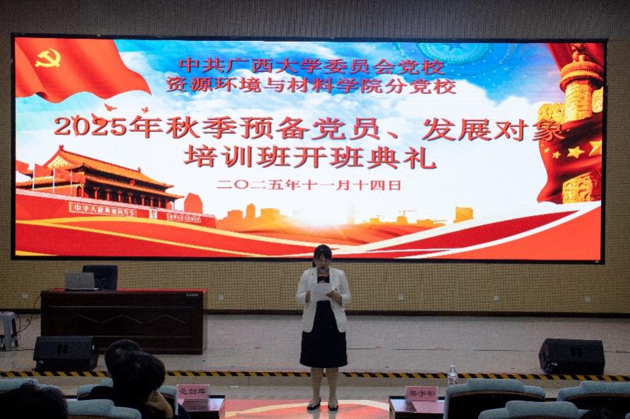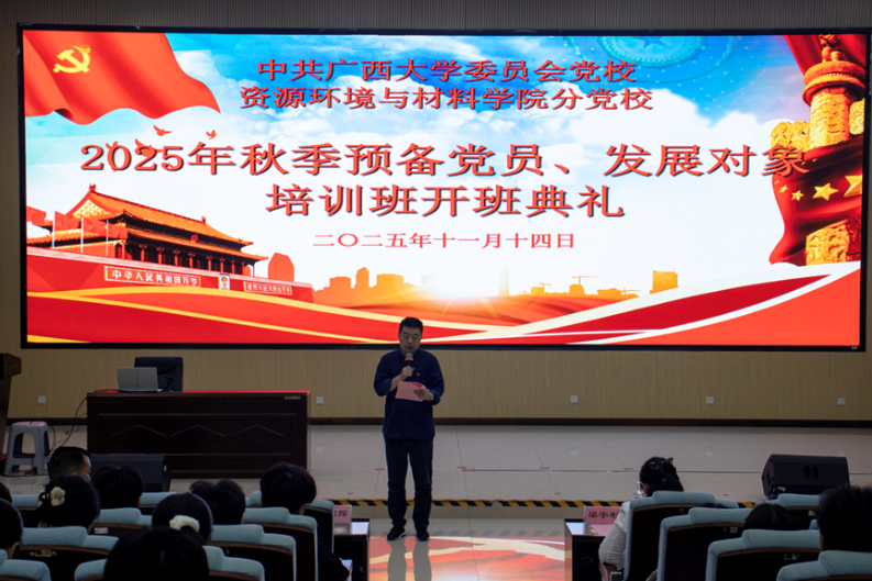 11月14日,我院2025年秋季预备党员、发展对象培训班开班典礼在学院123报告厅举行。学院党委副书记、纪委书记梁宇彬,预备党员培训班班主任梁迪顺,发展对象培训班班主任范剑辉,学工组辅导员陆一龙出席活动。
